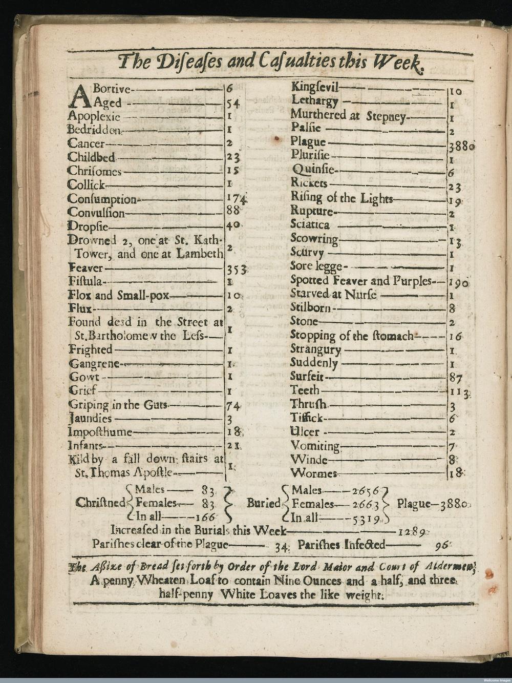 ------------------------------- The Wellcome Library in London has just made more than 100,000 of its medical-history images available for hi-res download under a CC-BY license. Among the images now freely available are a handful of bills of mortality from 1664 and 1665. Visit their Images page and search “bills of mortality” to see. And historian Craig Spence runs a blog exploring violent deaths in the bills of mortality, which is a great browse.