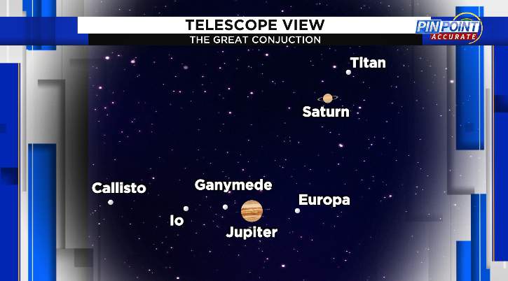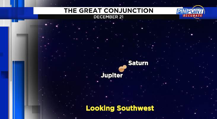 The Great Conjunction happens when Jupiter and Saturn get very close to each from our perspective. Not every Great Conjunction, however, is created equal and that’s what makes the one occurring on the winter solstice so rare and special. “Each Great Conjunction has different angular separations, or the distances between the two planets can vary by a bit depending on how everything is lined up,” said Seth Mayo, curator of astronomy at the Museum of Arts and Sciences in Daytona Beach. The last time the two planets were this close to each other, from Earth’s point of view, was back in 1623. “The problem for this Great Conjunction is that it occurred very near sunset, so the Sun’s glare most likely obscured the pair of planets,” Mayo said. “The last observable time these planets were this close was the year 1226.” Because the planets will be so close together near Christmas, it’s being dubbed the “Christmas Star” by some. On Dec 21, the two gas giants will be separated by only .1 degree. To the naked eye it will likely appear as two distinguishable separate points, rather than one “star”, but it does depend on ones eyesight and atmospheric conditions. If you have a telescope, the two planets will show up in the same field of view.