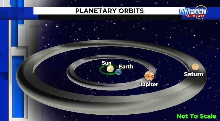 Saturn takes about 30 Earth years to make a trip around the sun. It takes Jupiter about 12 Earth years to do the same. In reality, Jupiter and Saturn are extremely far apart, but appear close together from Earth's point of view. Mars was intentionally left out of the diagram, but has an orbit between Earth and Jupiter. The Great Conjunction occurs because Jupiter has the inside track while orbiting the Sun in our solar system. Since Jupiter’s orbit is smaller than Saturn’s, Jupiter moves around the sun faster and catches up to the Ringed Planet. Think of it as NASCAR race with the infield being the Sun. The car that has the inside lane gets around the infield faster than a car on the outside. “On very rare occasions, these great conjunctions between Jupiter and Saturn can occur multiple times in year, known as triple conjunctions, due to Earth overtaking these planets with its much faster orbit.” Mayo said. “That won’t happen again until the 2238-2239 time frame, so we have some waiting to do.” The last time there was a triple conjunction was 1981. How To See:
