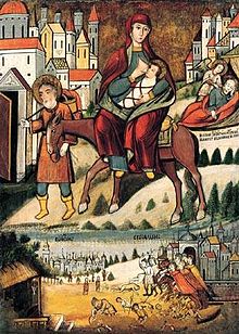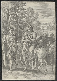The Flight into Egypt was a popular subject in art, showing Mary with the baby on a donkey, led by Joseph, borrowing the older iconography of the rare Byzantine Journey to Bethlehem. Nevertheless, Joseph is sometimes holding the child on his shoulders. Before about 1525, it usually formed part of a larger cycle, whether of the Nativity, or the Life of Christ or Life of the Virgin.