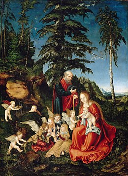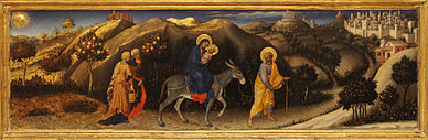 The flight into Egypt is a story recounted in the Gospel of Matthew (Matthew 2:13–23) and in New Testament apocrypha. Soon after the visit by the Magi, an angel appeared to Joseph in a dream telling him to flee to Egypt with Mary and the infant Jesus since King Herod would seek the child to kill him. The episode is frequently shown in art, as the final episode of the Nativity of Jesus in art, and was a common component in cycles of the Life of the Virgin as well as the Life of Christ. Within the narrative tradition, iconic representation of the "Rest on the Flight into Egypt" developed after the 14th century. Matthew's gospel account