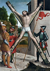 Andrew is said to have been martyred by crucifixion at the city of Patras (Patræ) in Achaea, in AD 60. Early texts, such as the Acts of Andrew known to Gregory of Tours, describe Andrew as bound, not nailed, to a Latin cross of the kind on which Jesus is said to have been crucified; yet a tradition developed that Andrew had been crucified on a cross of the form called crux decussata (X-shaped cross, or "saltire"), now commonly known as a "Saint Andrew's Cross" — supposedly at his own request, as he deemed himself unworthy to be crucified on the same type of cross as Jesus had been. The iconography of the martyrdom of Andrew — showing him bound to an X-shaped cross — does not appear to have been standardized until the later Middle Ages. The Acts of Andrew