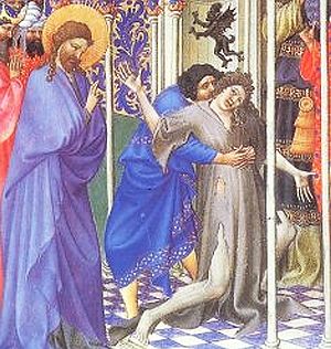 10And he was teaching in one of the synagogues on the sabbath day. 11And behold, a woman that had a spirit of infirmity eighteen years; and she was bowed together, and could in no wise lift herself up. 12And when Jesus saw her, he called her, and said to her, Woman, thou art loosed from thine infirmity. 13And he laid his hands upon her: and immediately she was made straight, and glorified God.Luke is the gospel writer who was a physician, and while his profession may have motivated his interest, nothing suggests a medical diagnosis. Asthenia throughout the New Testament means "weakness" or "powerlessness" of any kind, including sickness. Some have seen the affliction as ankylosing spondylitis, but an alternative interpretation is that hard labor over the years had bent the woman's back. The incident has been examined at length from the perspective of feminist theology by Francis Taylor Gench, who views it as both healing and liberating; Jesus goes on to say that the woman has been freed from a kind of bondage to Satan. The breaking of bonds or chains is often associated with freedom from an unclean spirit; in the case of the Gerasene demon (above), the demoniac had the physical power to break chains as a result of possession. Pneuma alalon The pneuma alalon is a speechless spirit who renders the possessed mute (Greek alalon, "without speech"). It thus differs from most possessing demons, who are given to taunts and mockery (diabolos, the origin of both "diabolic" and "Devil," means "slanderer" in Greek). Mark 9:14–29 relates that a boy is brought to Jesus for healing because he cannot speak; verse 25 adds that he cannot hear. This demonic possession manifests itself through symptoms that resemble epilepsy, as is suggested also by Matthew 17:15, who uses a form of the colloquial verb seleniazetai ("moonstruck") for the condition. Although traditionally epilepsy was regarded as "the sacred disease," Jews and Christians attributed the affliction to a demon. The Babylonian Talmud specifies that a child's epilepsy was caused by "the demon of the privy," which attached to the father when he had sex too soon after relieving himself; that is, he was impure:After coming back from the lavatory (bet ha-kissê), one should wait [some time] before sexual intercourse, as the demon of the lavatory accompanies him. If he does not wait, the offspring will be epileptic.Unforgivable sinBefore Jesus, exorcism had been conducted by a trained practitioner who offered a diagnosis and administered a ritual usually employing spoken formularies, amulets or other objects, or compounds of substances resembling pharmacological recipes of the time. Jesus's approach seemed radical because it depended on spiritual authority alone. Jesus casts out the pneuma alalon in front of a crowd who exclaim "Nothing like this has ever happened in Israel!" The Pharisees, also witnesses, counter that "the leader of the demons gives him power to force out demons." This accusation leads to the "Beelzebub controversy." Mark 3:29–30 warns that attributing the power of the Holy Spirit to possession by an "unclean spirit" is a sin that cannot be forgiven. The theological concept is difficult and subject to varying interpretations. In Mark 3:20–22, Jesus returns home from performing miracles, but a crowd gathers: "There were so many people that Jesus and his followers could not eat. When his family heard this, they went to get him because they thought he was out of his mind. But the teachers of the law from Jerusalem were saying, 'Beelzebul is living inside him! He uses his power from the ruler of demons to force demons out of people'." In his response to this accusation, Jesus says that speaking out against the Holy Spirit is an unforgivable sin: "Jesus said this because the people were saying that he had an evil spirit in him." Luke 12:10 clarifies that "if you speak against the Son of Man, you can be forgiven, but if you speak against the Holy Spirit, you cannot be forgiven." Early Christian exorcism