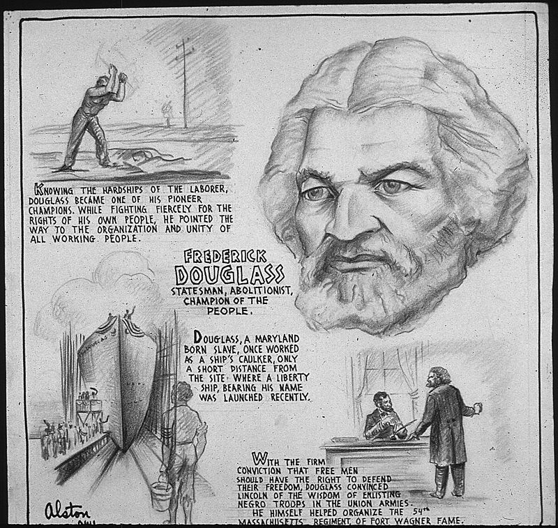 - In 1938–39, African-American artist Jacob Lawrence created The Frederick Douglass series of narrative paintings. They were part of the historical series started by Lawrence in 1937, which included painted panels about prominent Black historical figures such as Toussaint Louverture and Harriett Tubman. During his preparatory work, Lawrence conducted research at the Schomburg Center for Research in Black Culture, drawing primarily from the autobiographies of Frederick Douglass: Narrative of the Life of Frederick Douglass, an American Slave (1845) and Life and Times of Frederick Douglass (1881). For this series the artist used a multipanel-plus-caption format that allowed him to develop a serial narrative that was not possible to convey by means of traditional portrait or history painting. Instead of reproducing Douglass's original narratives verbatim, Lawrence constructed his own visual and textual narrative in the form of 32 panels painted in tempera and accompanied with Lawrence's own captions. The structure of the painting series is linear and consists of three parts (the slave, the fugitive, the free man) which offer an epic chronicle of Douglass's transformation from slave to leader in the struggle for the liberation of Black people. The Frederick Douglass series is currently in the Hampton University Museum.