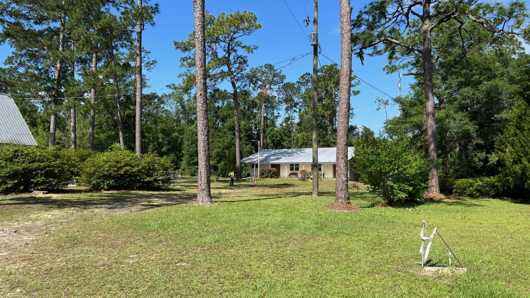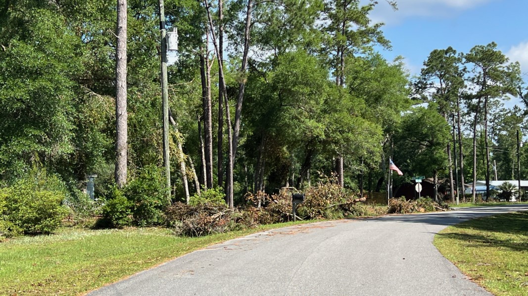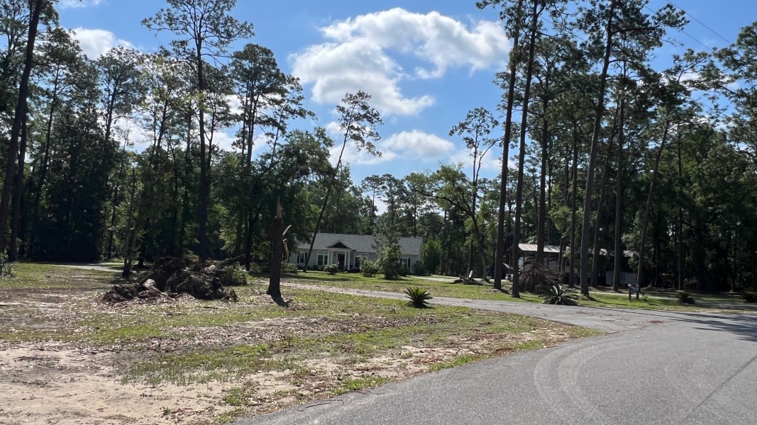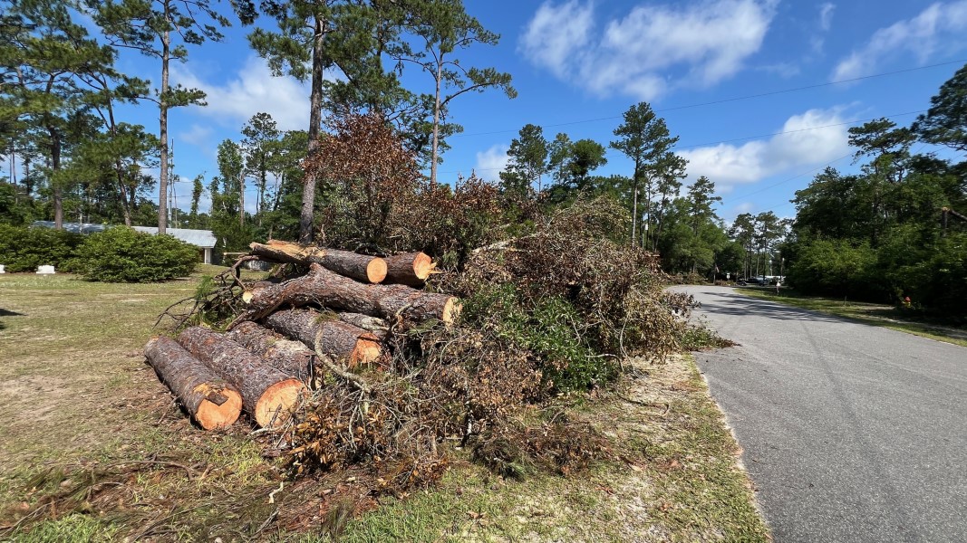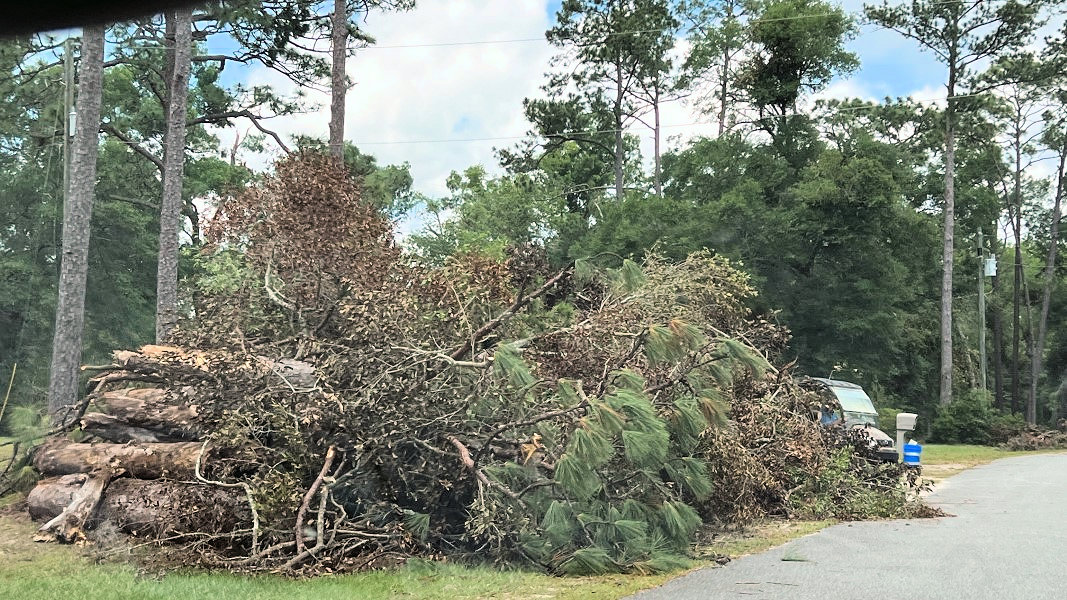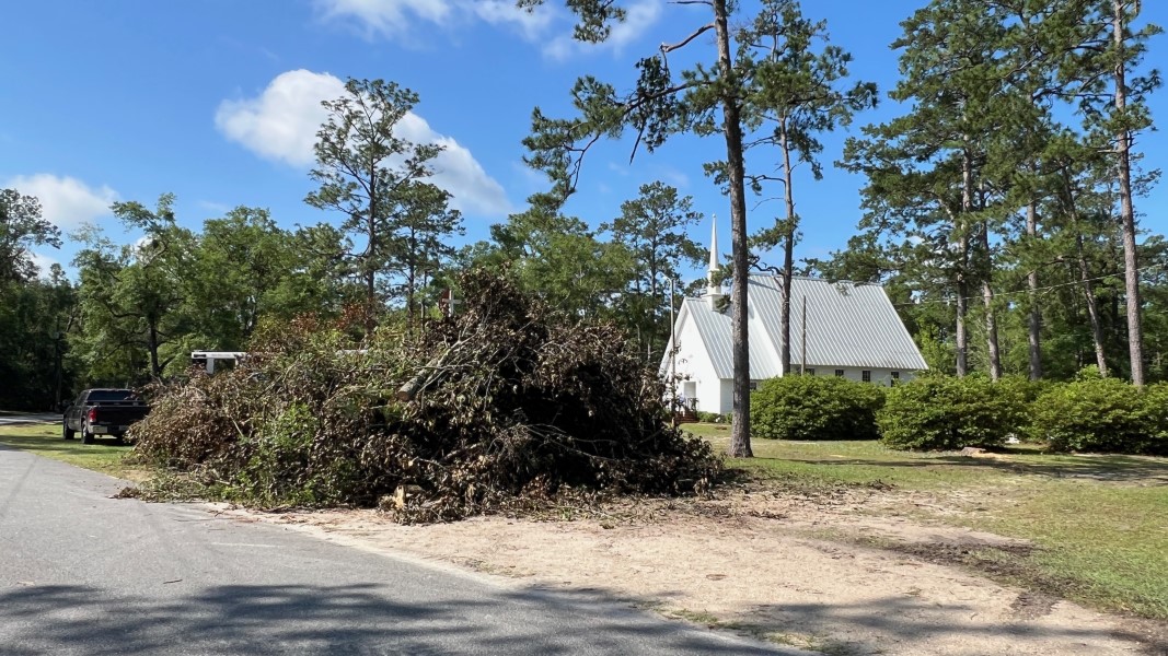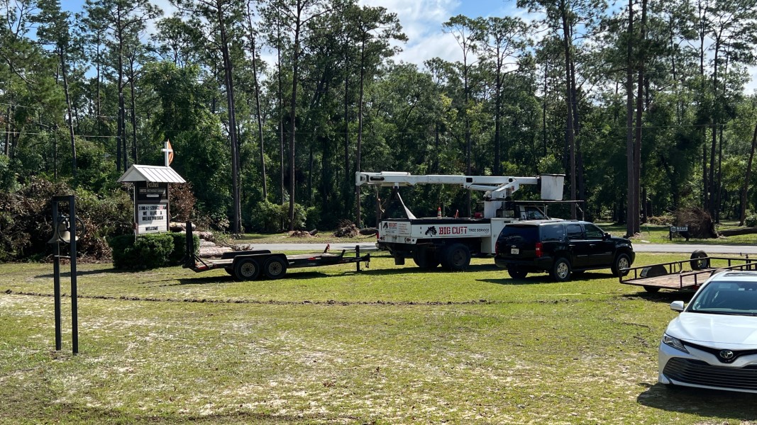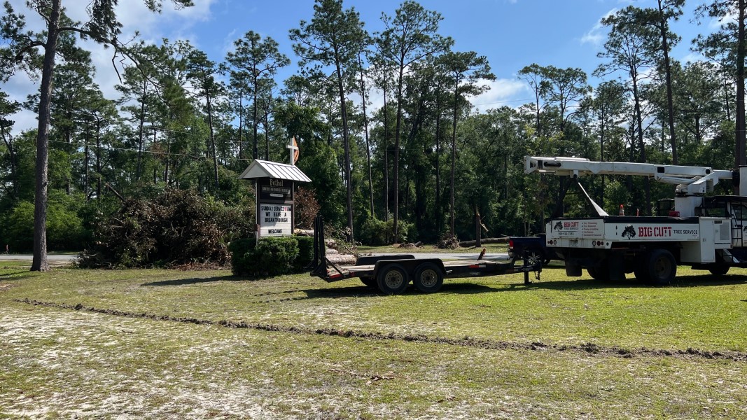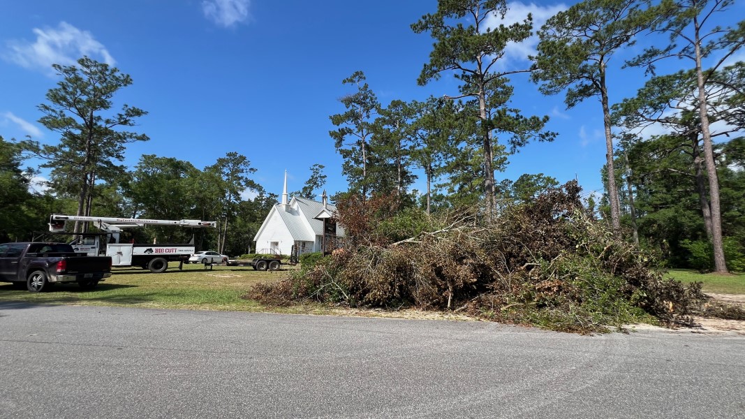 These pictures were taken on Sunday, as we arrived at church after the tornado came through. BIG CUTT Tree Service was in the process of cutting and gathering trees and debris from the propert.(Note: If you change the width of the page, the pictures will adjust with it.)