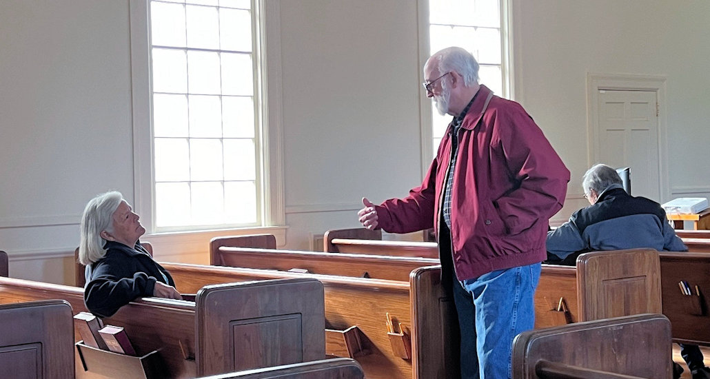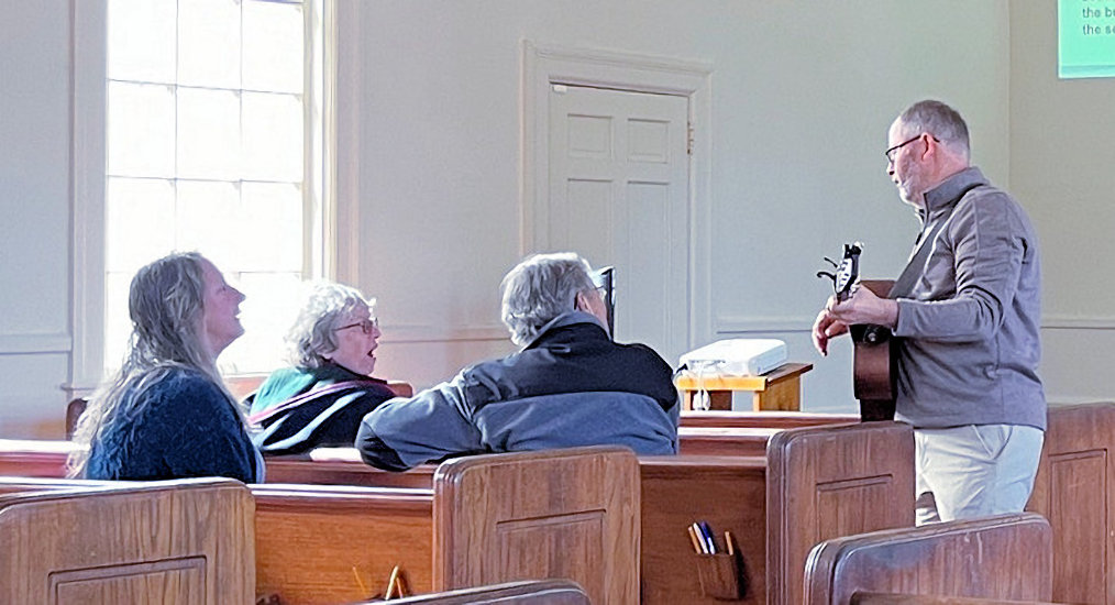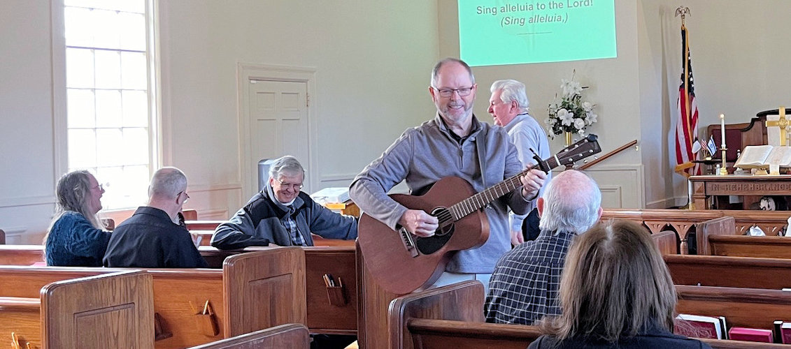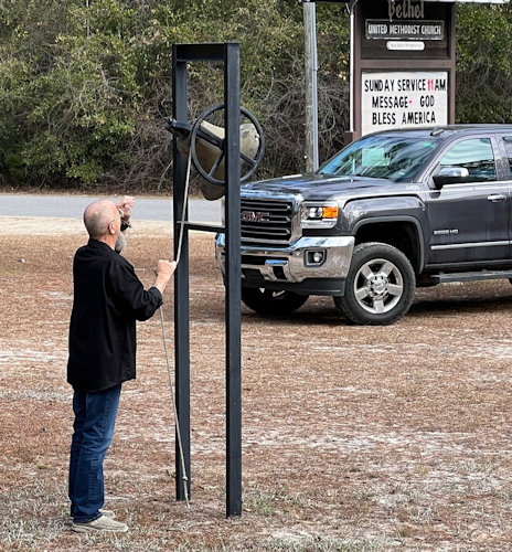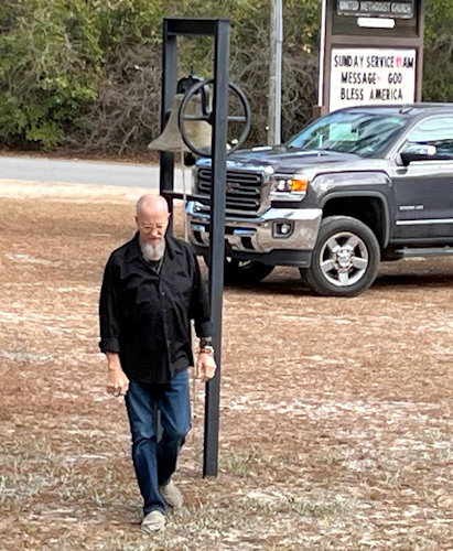 Mark Carlson "announces" the Sunday service to the neighborhood