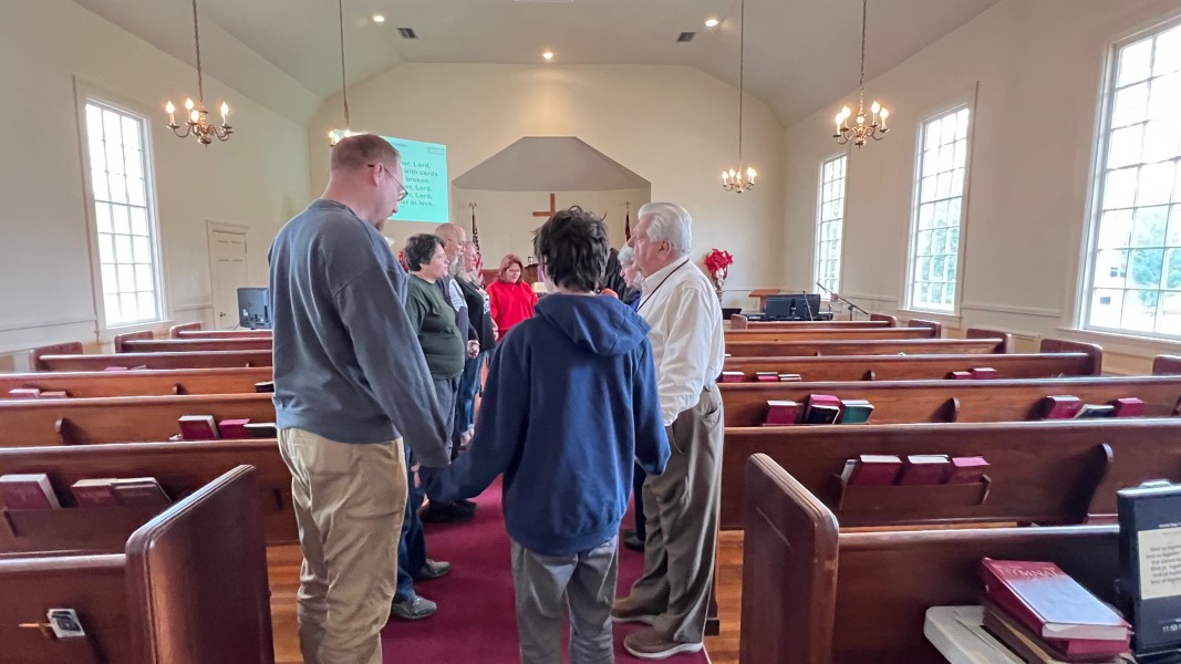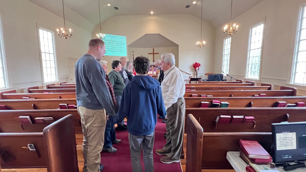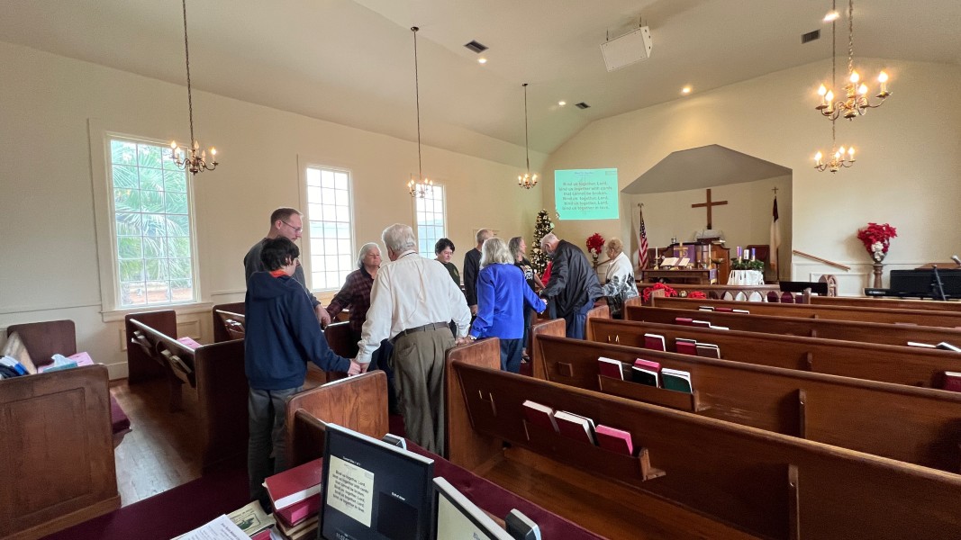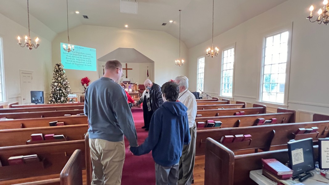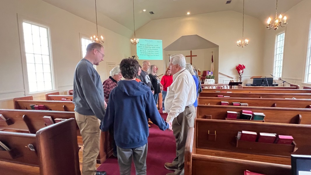 Gather in the center aisle, join hands, sing the closing chorus: "Bind Us Together"